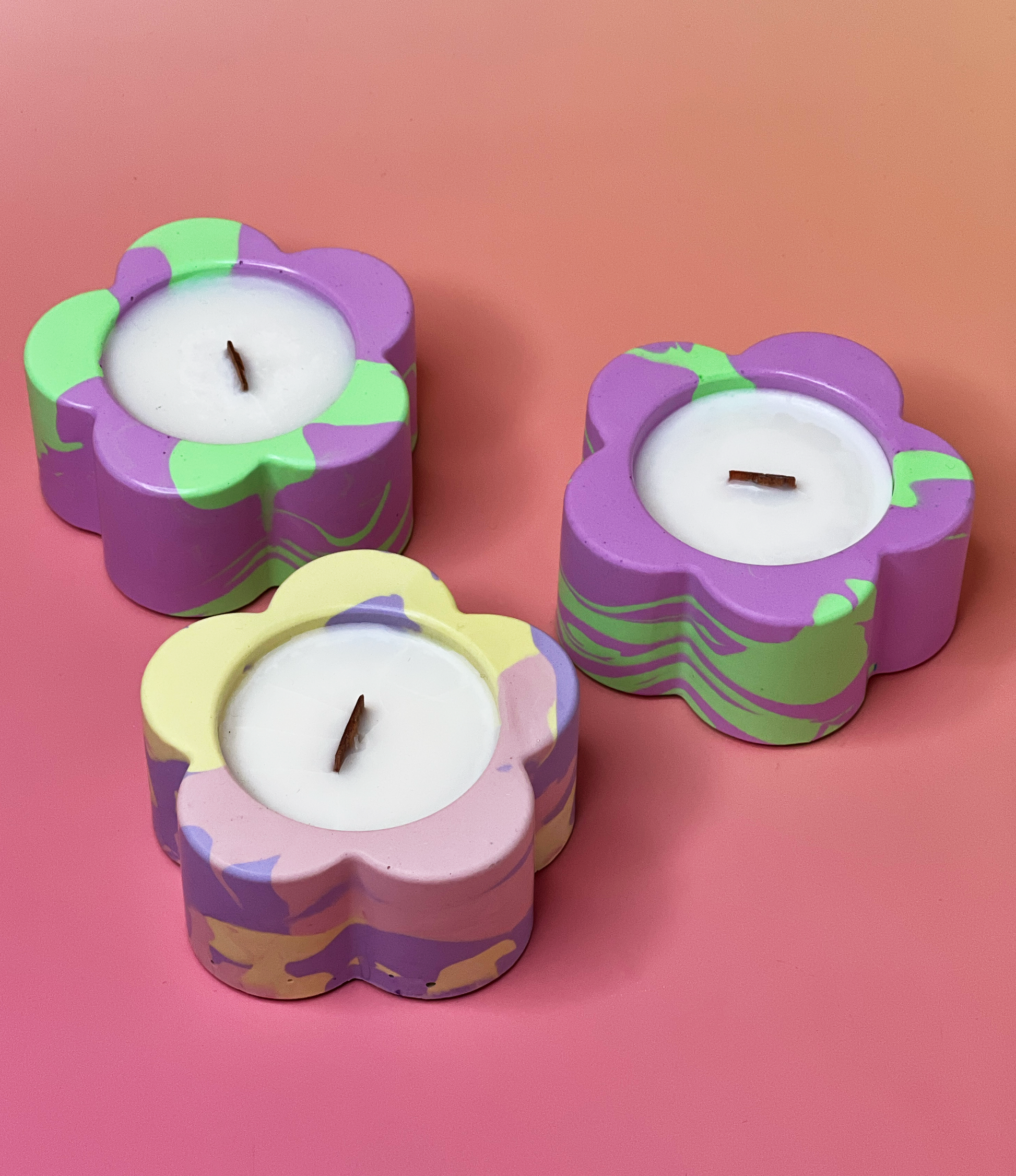 Tiny flowers, big color pop. These mini flower-shaped candles are hand-poured into colorful jesmonite vessels — each one a unique little shelf treat. Perfect for colorful home accents, gifting, or adding a playful touch to your desk, vanity, or bedside table.